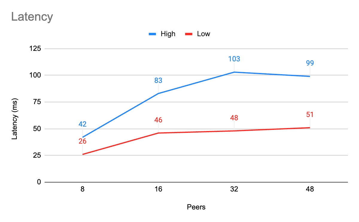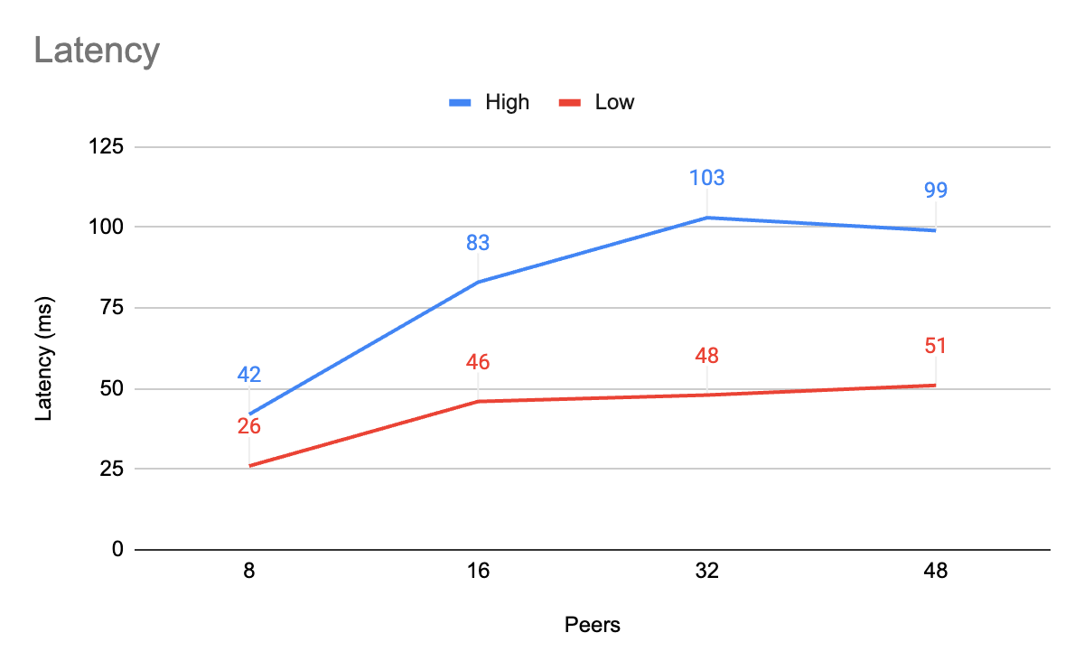 The results showed latency as low as 26ms with 8 peers and as high as 103ms with 32 peers. Not shown on the graph is that the average throughput with this configuration was between 262,000 - 289,000 TPS for all peer counts. More peers slightly increases the throughput, but where most games only require between 60-120 TPS x the number of peers, TCE provides almost an order of magnitude of headroom for TPS.